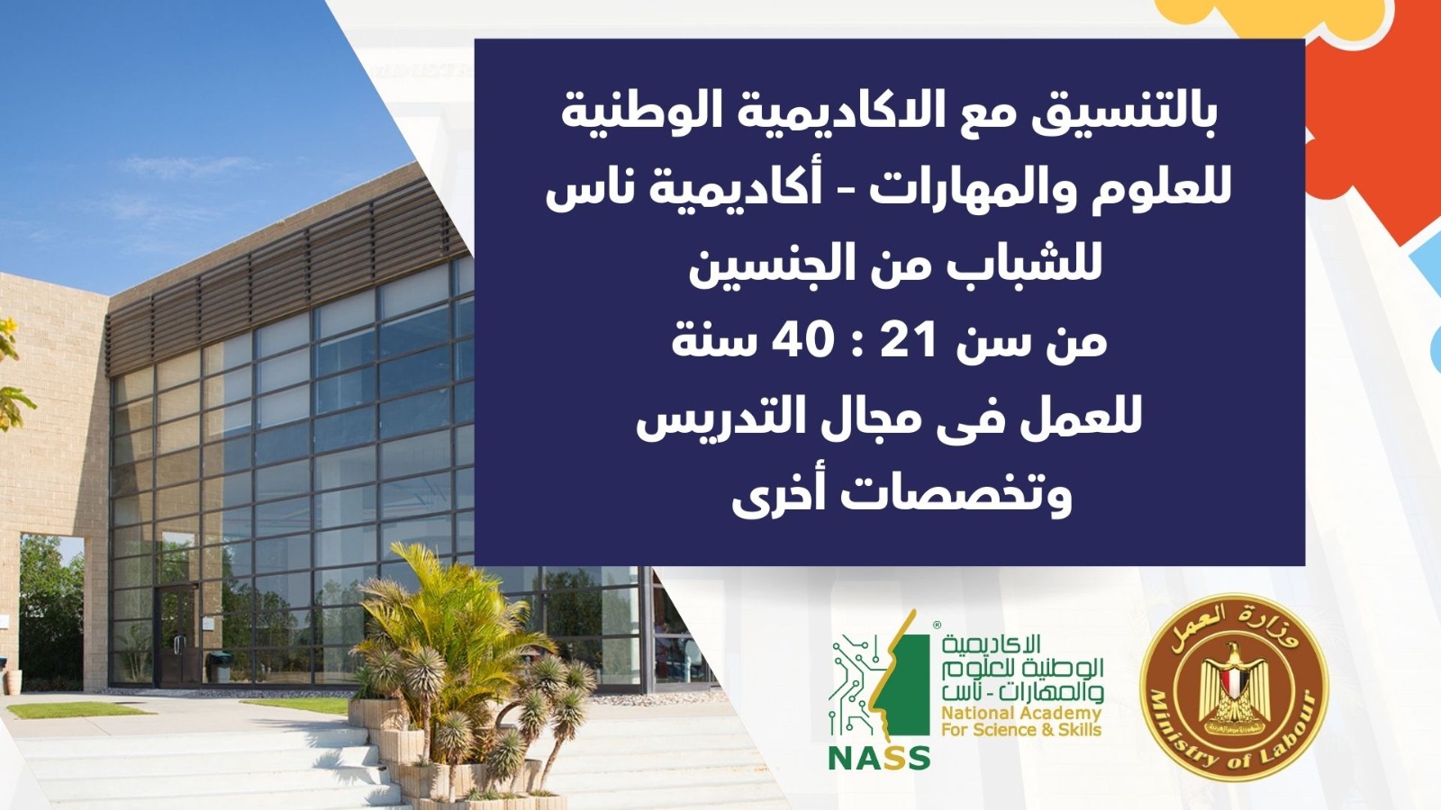 أعلنت وزارة العمل اليوم الأربعاء، عن توفير 945 فرصة عمل للشباب من الجنسين، من سن 21 حتى 40 سنة من حملة المؤهلات العليا، حسب كل تخصص، للعمل على وظائف التدريس والتمريض وغيرها من التخصصات، بالأكاديمية الوطنية للعلوم والمهارات "أكاديمية ناس"،وذلك برواتب مجزية يجرى تحديدها خلال المقابلة الشخصية مع مسئولى "الأكاديمية" وفقًا لخبرة المتقدمين،تحت إشراف الإدارة العامة..