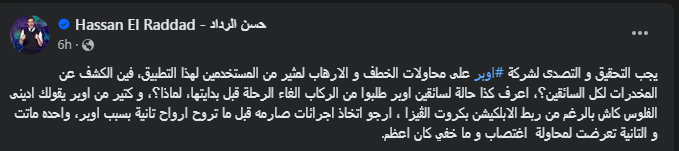وأنهى الرداد منشوره برجاء: حيث قال: ارجو اتخاذ إجراءات صارمة قبل ما تروح أرواح تانية بسبب اوبر، واحده ماتت والتانية تعرضت لمحاولة اغتصاب وما خفي كان اعظم.