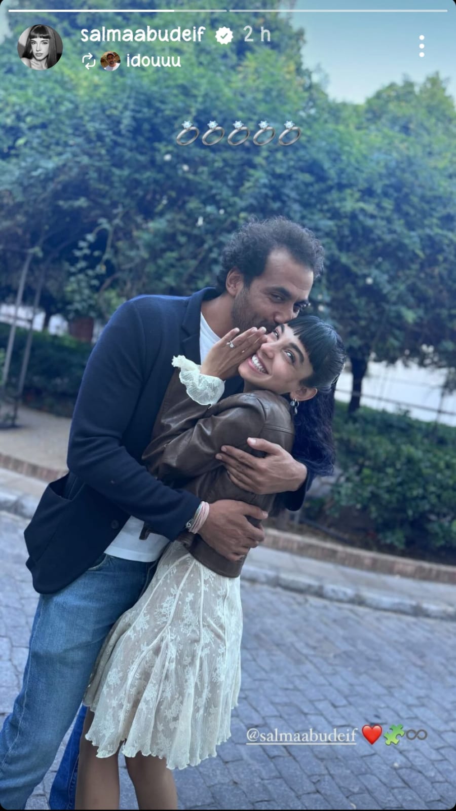 نشرت سلمي أبو ضيف صورة لها من خلال خاصية “الاستوري” على موقع التواصل الاجتماعي انستجرام مع شاب من خارج الوسط الفني يدعى إدريس عبد العزيز وهي تستعرض خاتم الخطوبة على اصبعها.