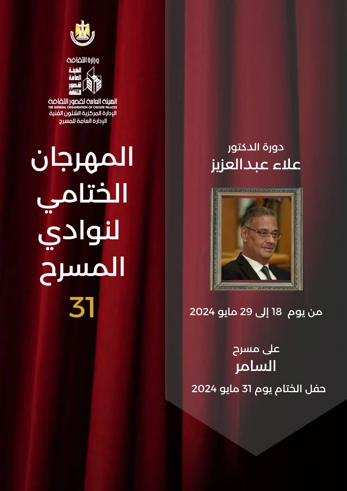 تطلق الهيئة العامة لقصور الثقافة، في تمام السادسة من مساء السبت المقبل، فعاليات الدورة الحادية والثلاثين للمهرجان الختامي لنوادي المسرح "دورة الكاتب المسرحي الراحل علاء عبد العزيز"، وذلك على مسرح السامر بالعجوزة، ومسرح قصر ثقافة روض الفرج، في الفترة من 18 إلى 31 مايو الحالي.