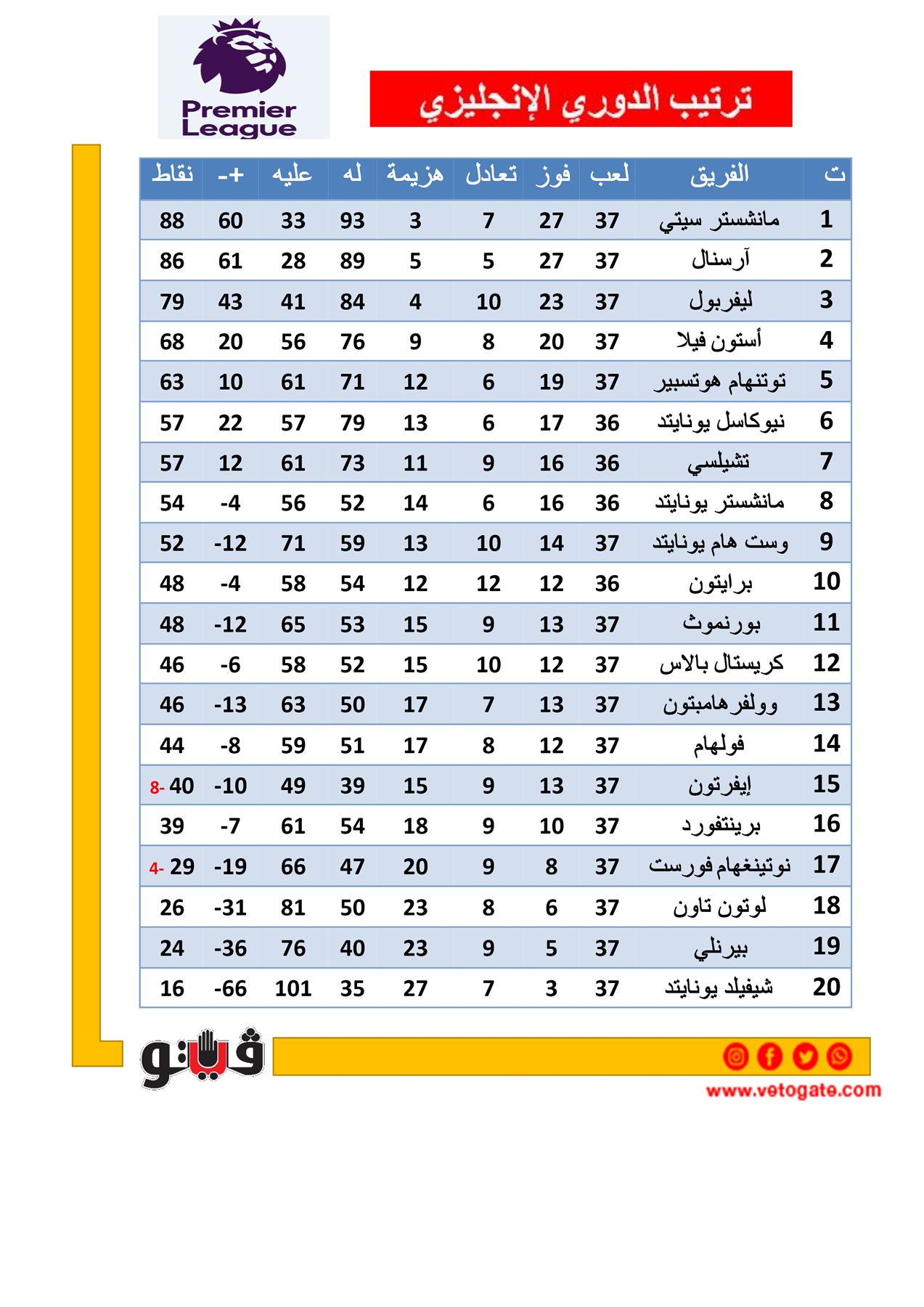 1- مانشستر سيتي 88 نقطة (يتبقى له مباراة)