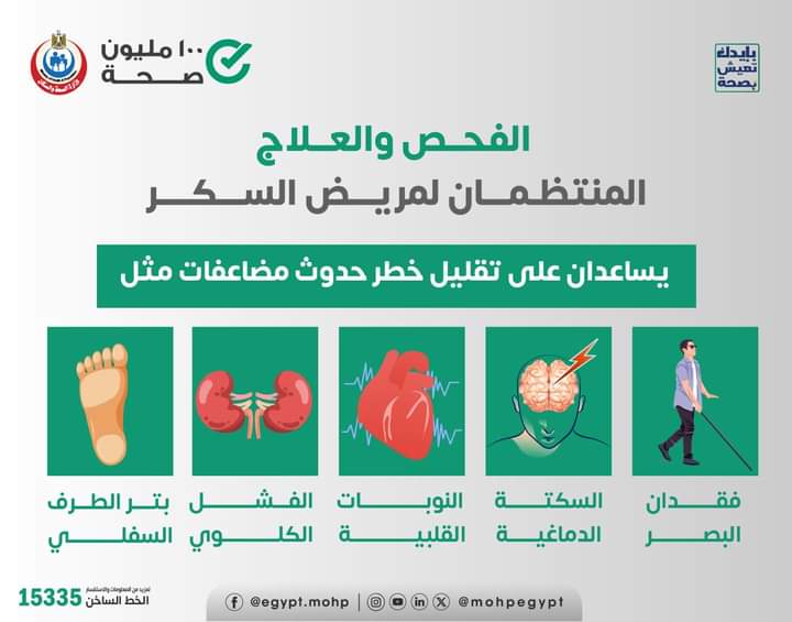 وأكدت وزارة الصحة أن الفحص والعلاج المنتظمان لمريض السكر يساعدان على تقليل خطر حدوث مضاعفات كالسكتة الدماغية والنوبات القلبية والفشل الكلوي وفقدان البصر وبتر الأطراف.