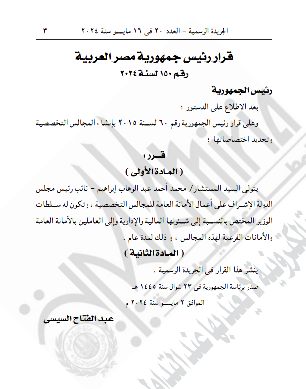 نشرت الجريدة الرسمية في عددها رقم 20، الصادر في 16 مايو 2024، قرارا جمهوريا جديدا اليوم للرئيس عبد الفتاح السيسي، بشأن تولى المستشار محمد أحمد عبد الوهاب إبراهيم، نائب رئيس مجلس الدولة الإشراف على أعمال الأمانة العامة للمجالس التخصصية.