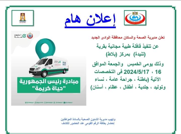 حياة كريمة تنظم قافلة طبية مجانية ببلاط الوادي الجديد