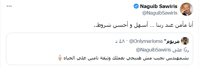 تعليق نجيب ساويرس جاء ردًا على طلب إحدى متابعاته التي وجهت إليه سؤال قالت فيه: «بشمهندس نجيب.. مش هتيجي نعملك وثيقة تأمين على الحياة؟».