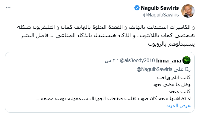 ليرد المهندس نجيب ساويرس قائلًا: «والكاميرات استبدلت بالهاتف والقعدة الحلوة بالهاتف كمان والتليفزيون شكله هيختفي كمان باللابتوب.. والذكاء هيستبدل بـ الذكاء الصناعي.. فاضل البشر يستبدلوهم بالروبوت».
