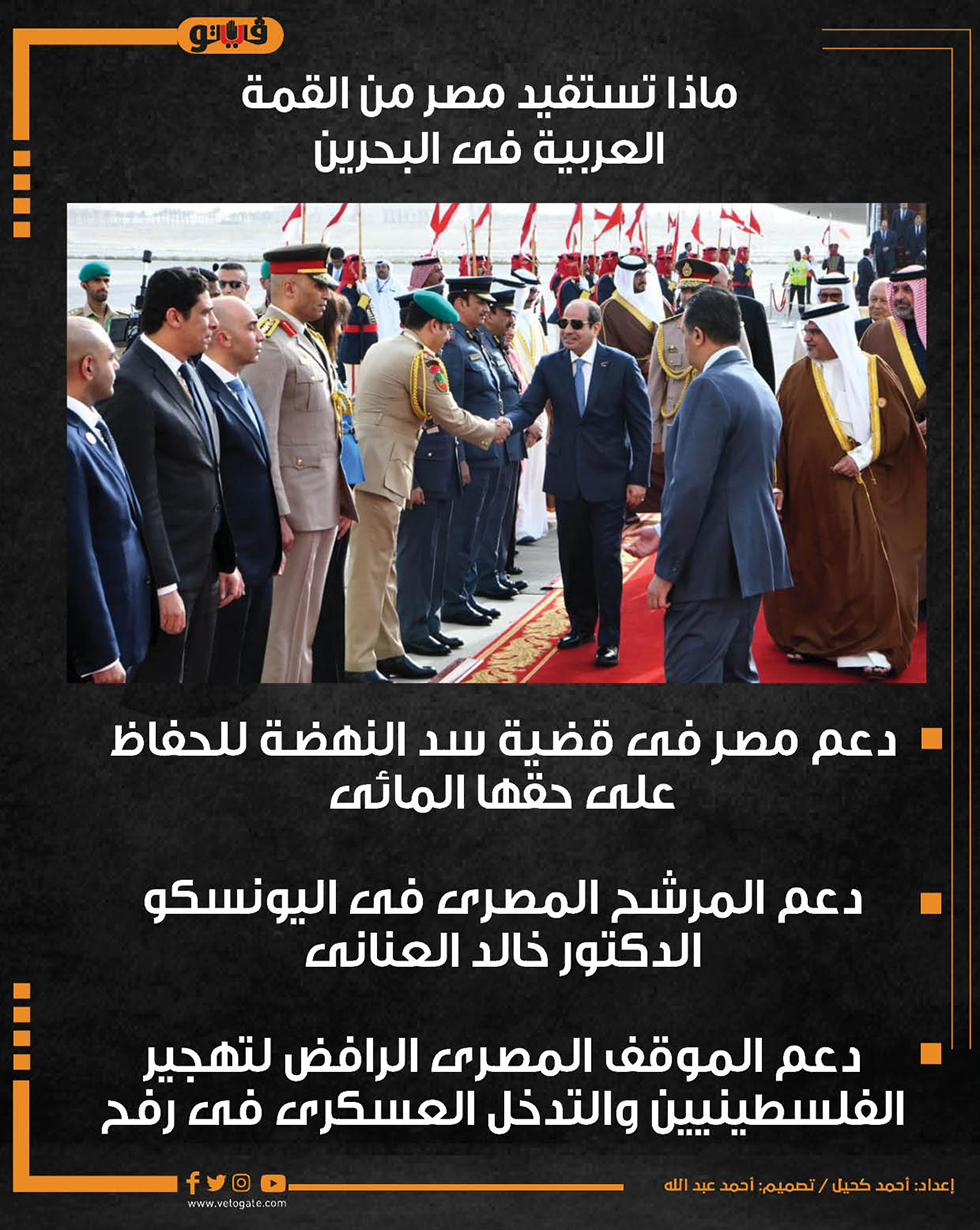 ماذا تستفيد مصر من القمة العربية فى البحرين (إنفوجراف) الخميس 16/مايو/2024 - 12:54 م 5/16/2024 12:54:26 PM الرئيس عبد الفتاح السيسى لحظة وصولة البحرين، فيتو أحمد كحيل شارك طباعة 18 حجم الخط شارك طباعة القمة العربية قمة البحرين مصر وقمة البحرين القمة العربية 33 القمة العربية في البحرين