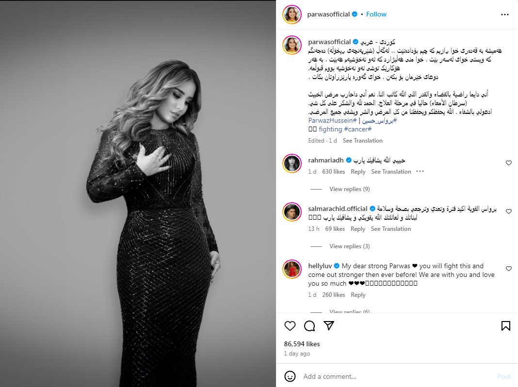 وكتبت برواس حسين في منشور على صفحتها الرسمية على موقع التواصل الاجتماعي “انستجرام”: “ أني دايما راضية بالقضاء والقدر اللي الله كاتب النا، نعم أني أحارب مرض الخبيث (سرطان الأمعاء) حاليا في مرحلة العلاج، الحمد لله والشكر على كل شي”.