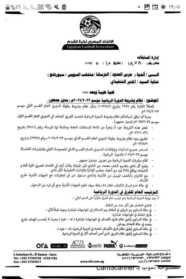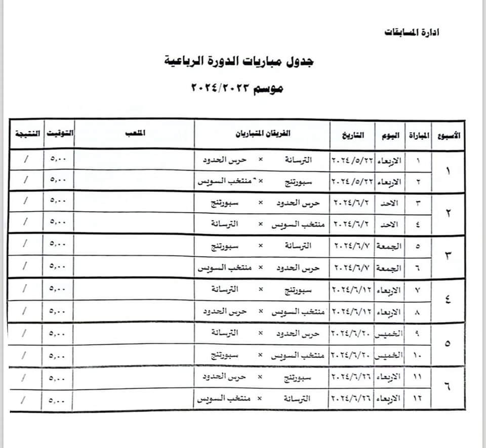 وكان اتحاد الكرة، قد أعلن نظام وشروط الدورة الرباعية “دورة الترقي” موسم ٢٠٢٤/٢٠٢٣ والمؤهلة لبطولة الدوري المصري الممتاز بمشاركة 4 أندية وهم حرس الحدود ومنتخب السويس والترسانة وسبورتنج.