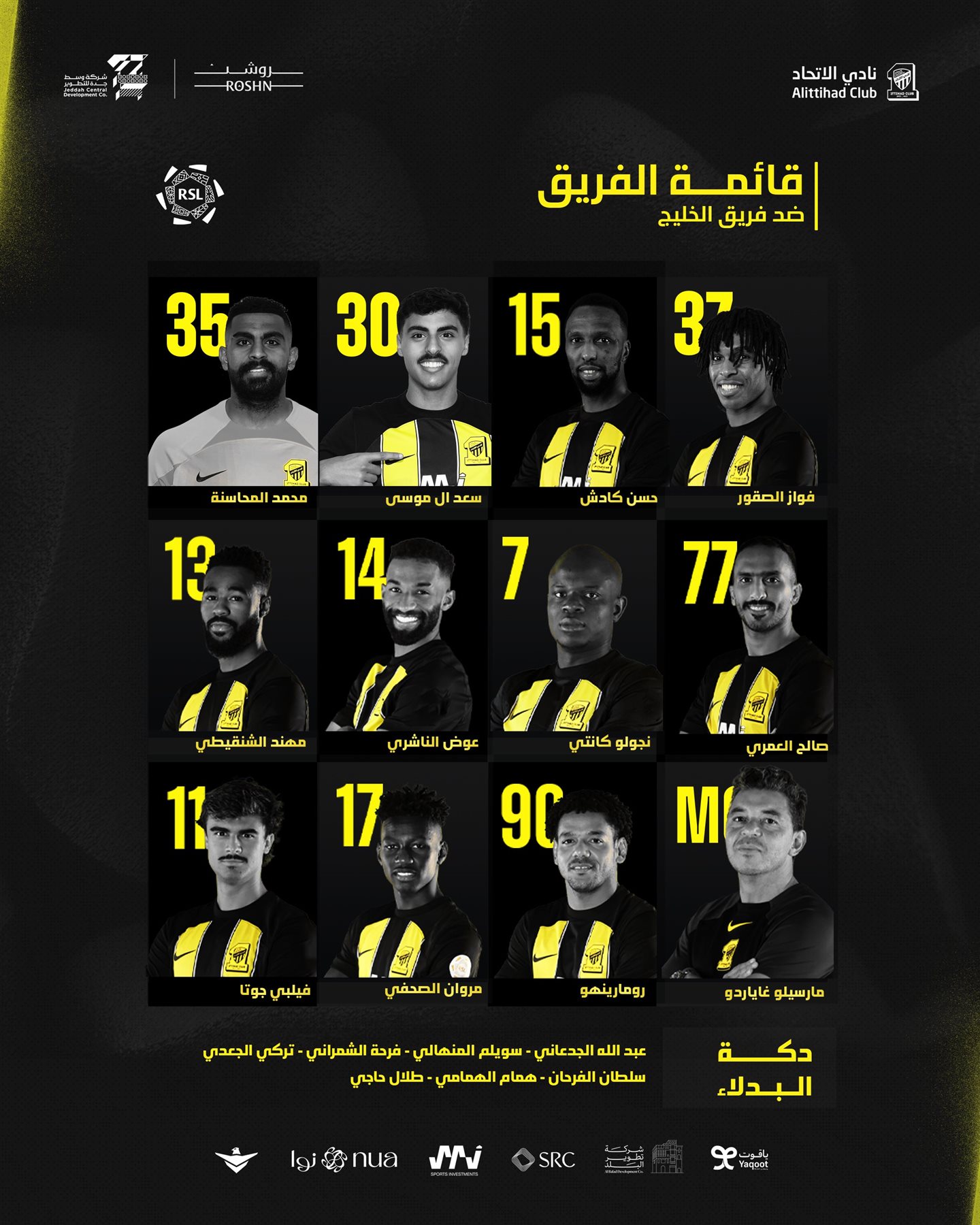 الدوري السعودي، أعلن مدربا فريقا الخليج واتحاد جدة تشكيل الفريقين للمباراة التي تقام على استاد الأمير محمد بن فهد، مساء اليوم الخميس، في الجولة 32 من دوري روشن السعودي للمحترفين.