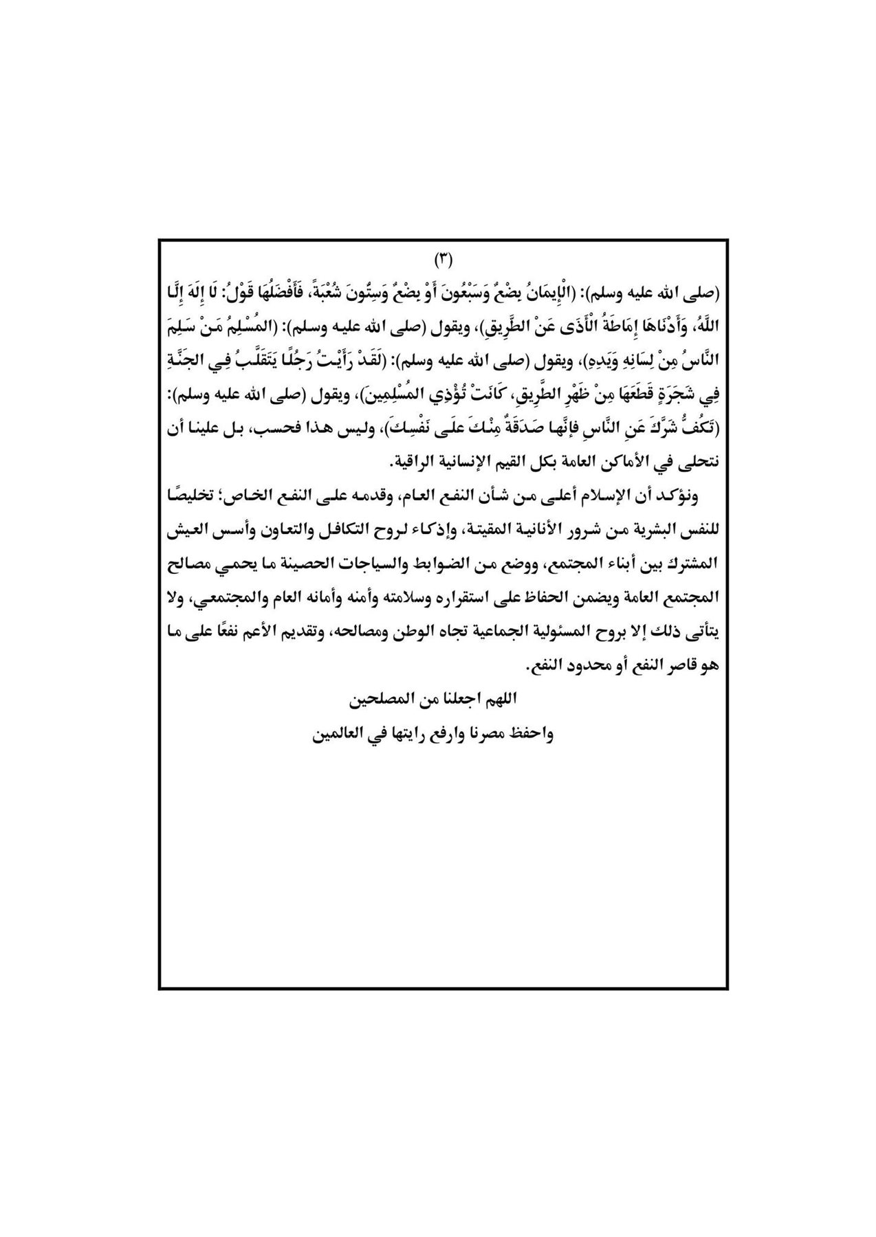 حددت وزارة الأوقاف موضوع خطبة اليوم الجمعة تحت عنوان: "واجبنا تجاه المنافع المشتركة والأماكن والمرافق العامة".