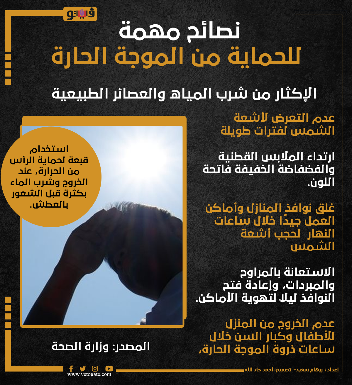 نصائح مهمة للحماية من الموجة الحارة (انفوجراف) الأربعاء 22/مايو/2024 - 12:31 م 5/22/2024 12:31:06 PM الموجة الحارة، فيتو ريهام سعيد شارك طباعة 18 حجم الخط شارك طباعة الخروج من المنزل التعرض لأشعة الشمس العصائر الطبيعية ذروة الموجة الحارة الموجة الحارة وزارة الصحة لاشعة الشمس
