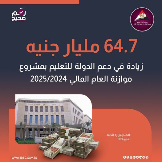 سلط مركز المعلومات ودعم اتخاذ القرار بمجلس الوزراء الضوء على زيادة دعم الدولة للتعليم بمشروع الموازنة للعام المالي 2024 -2025.
