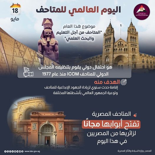 كشف مركز المعلومات ودعم اتخاذ القرار بمجلس الوزراء عن موضوع اليوم العالمي للمتاحف هذا العام، حيث يأتي هذا العام بعنوان المتاحف من أجل التعليم والبحث العلمي.
