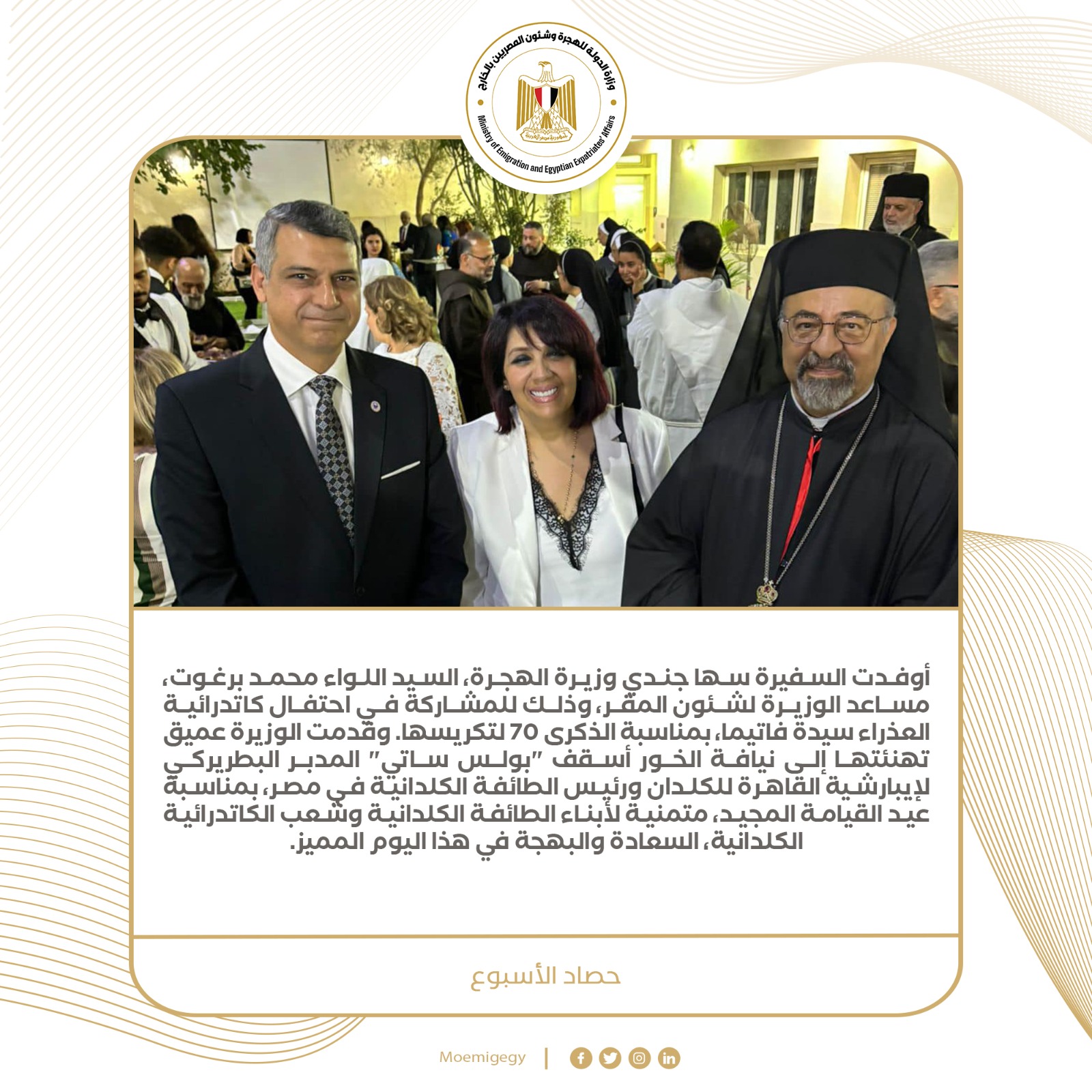 وقدمت الوزيرة عميق تهنئتها إلى الخور أسقف "بولس ساتي" المدبر البطريركي لإيبارشية القاهرة للكلدان ورئيس الطائفة الكلدانية في مصر، بمناسبة عيد القيامة المجيد، متمنية لأبناء الطائفة الكلدانية وشعب الكاتدرائية الكلدانية، السعادة والبهجة في هذا اليوم المميز.