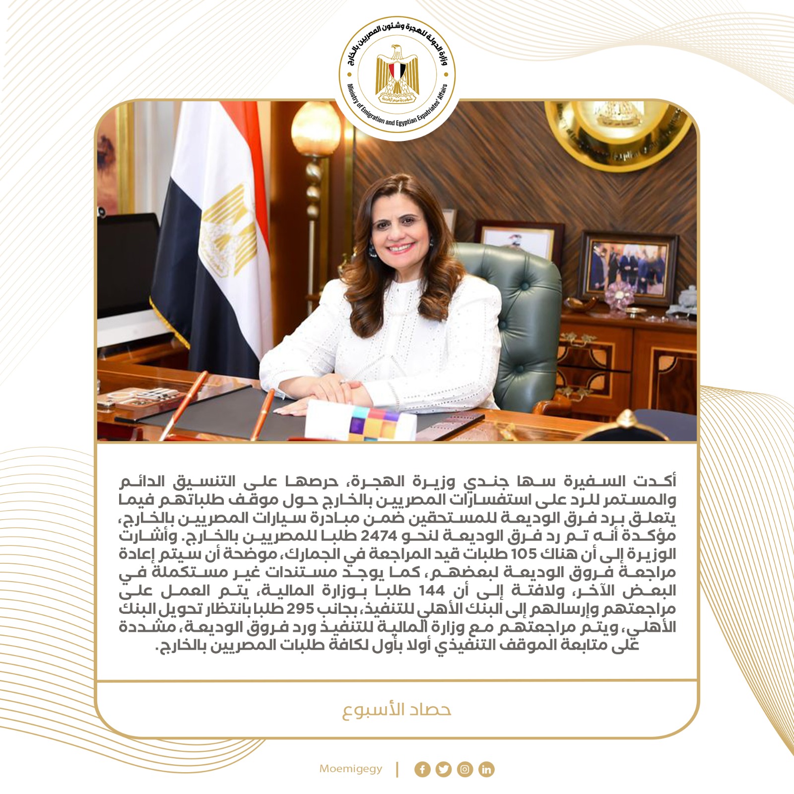 12 - أكدت السفيرة سها جندي وزيرة الهجرة، حرصها على التنسيق الدائم والمستمر للرد على استفسارات المصريين بالخارج حول موقف طلباتهم فيما يتعلق برد فرق الوديعة للمستحقين ضمن مبادرة سيارات المصريين بالخارج، مؤكدة أنه تم رد فرق الوديعة لنحو 2474 طلبا للمصريين بالخارج. وأشارت الوزيرة إلى أن هناك 105 طلبات قيد المراجعة في الجمارك، موضحة أن سيتم إعادة مراجعة فروق الوديعة لبعضهم، كما يوجد مستندات غير مستكملة في البعض الآخر، ولافتة إلى أن 144 طلبا بوزارة المالية، يتم العمل على مراجعتهم وإرسالهم إلى البنك الأهلي للتنفيذ، بجانب 295 طلبا بانتظار تحويل البنك الأهلي، ويتم مراجعتهم مع وزارة المالية للتنفيذ ورد فروق الوديعة، مشددة على متابعة الموقف التنفيذي أولا بأول لكافة طلبات المصريين بالخارج،.
