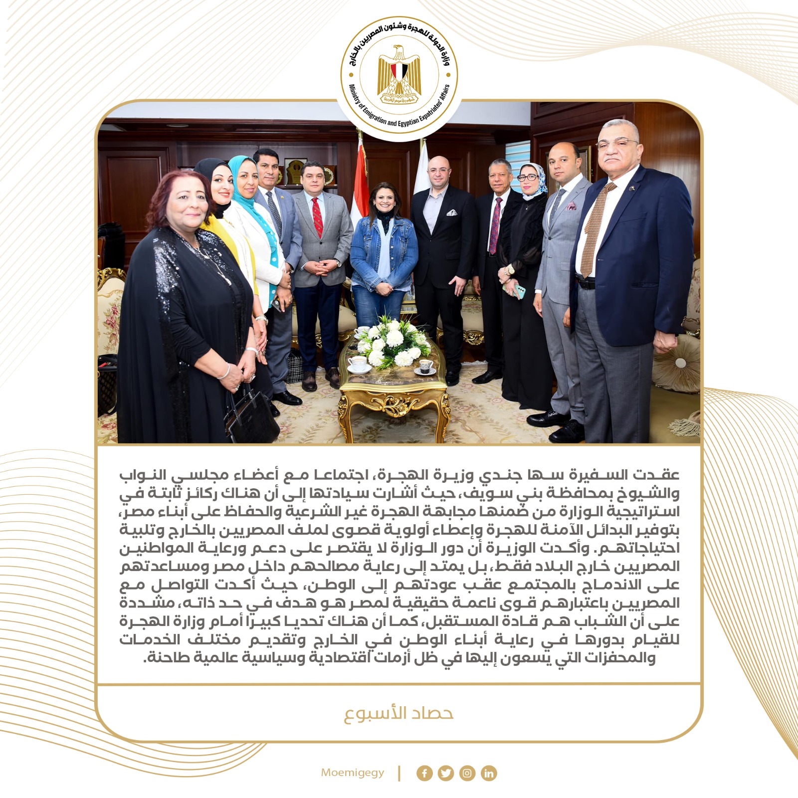 6 - عقدت السفيرة سها جندي وزيرة الهجرة، اجتماعا مع أعضاء مجلسي النواب والشيوخ بمحافظة بني سويف، حيث أشارت إلى أن هناك ركائز ثابتة في استراتيجية الوزارة من ضمنها مجابهة الهجرة غير الشرعية والحفاظ على أبناء مصر، بتوفير البدائل الآمنة للهجرة وإعطاء أولوية قصوى لملف المصريين بالخارج وتلبية احتياجاتهم.