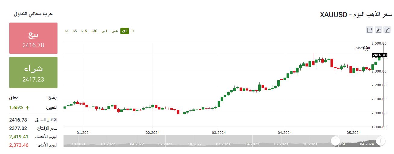 مؤشر الذهب، ارتفع المؤشر العالمى للذهب اليوم بحركة التعاملات إلى مستوى غير مسبوق حيث سجلت سعر الأونصة العالمية للذهب اليوم مستوى 2417.23 دولار للأونصة الواحدة، بزيادة أكثر من 55 دولار في الأوقية الواحدة مقارنة بحركة تعاملات أمس الجمعة.