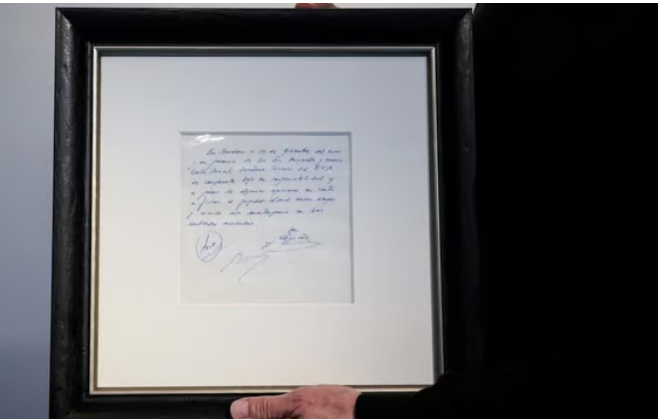 وكتب على المنديل الخاص في نادي بومبيا للتنس: "إنه في 14 ديسمبر 2000 في برشلونة وبحضور السادة مينجيلا وهوراسيو، وافق كارليس ريشاك المدير الرياضي لنادي برشلونة وتحت مسؤوليته وبغض النظر عن أي أراء مخالفة، على التوقيع مع اللاعب ليونيل ميسي بشرط أن يتم ذلك بالمبالغ المتفق عليها".