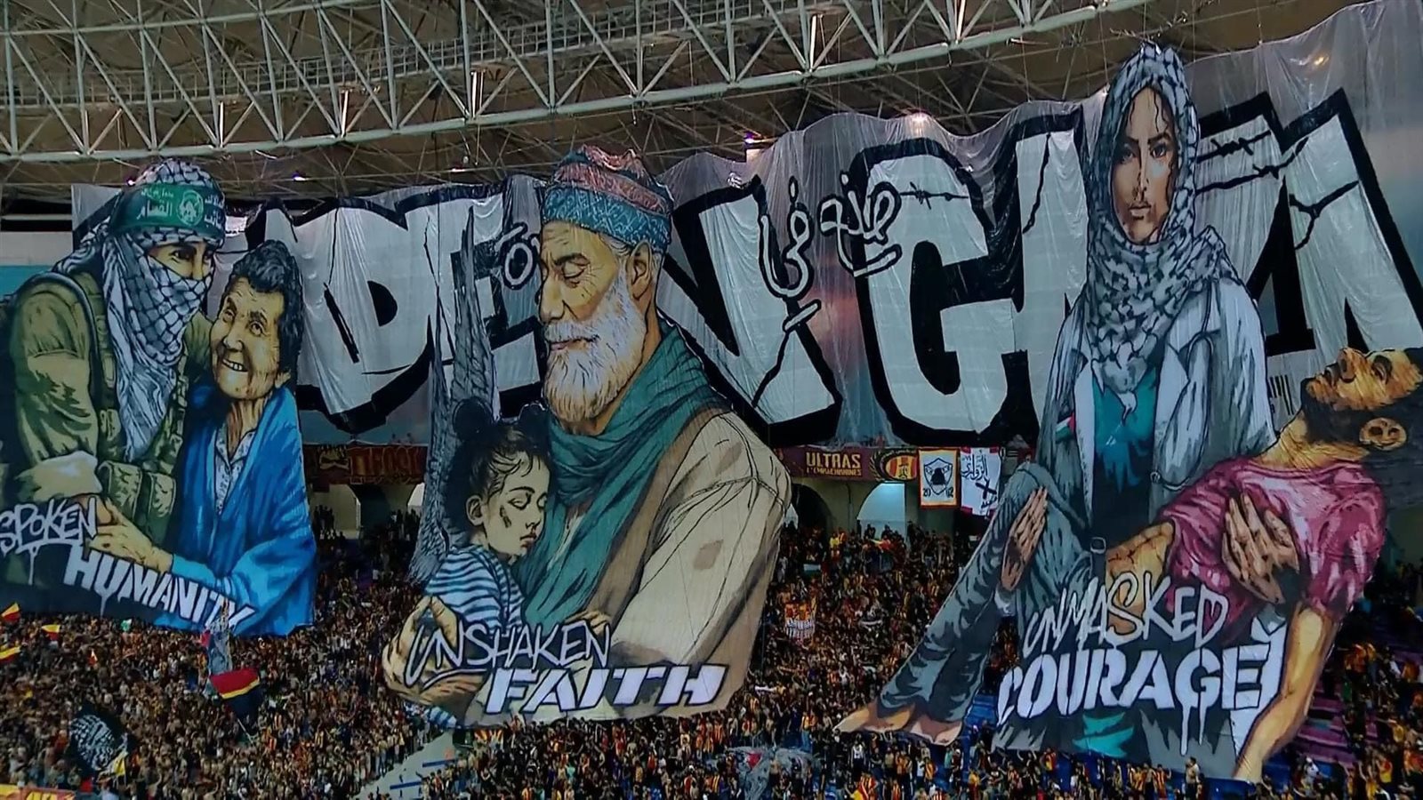 وحملت لافتات جماهير الترجي عبارة: "أرض حرة في عالم محتل.. هذه هي قيمنا النبيلة".