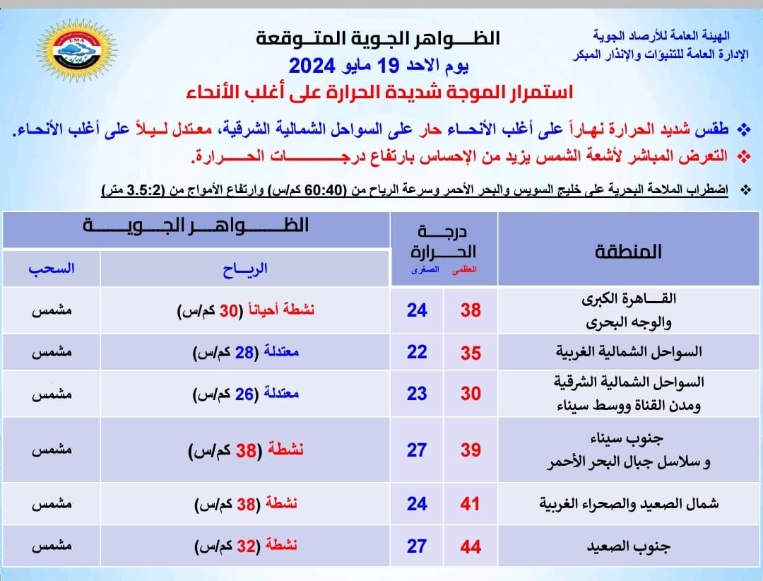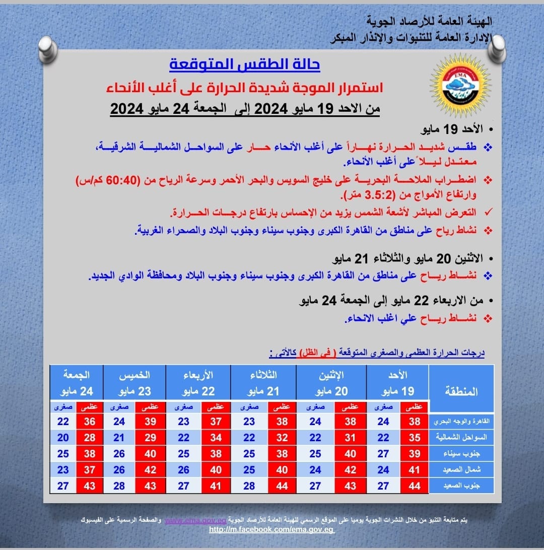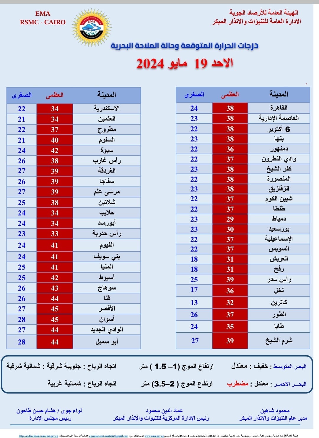 كما نشرت هيئة الأرصاد الجوية بيانا بدرجات الحرارة المتوقعة اليوم على مدن ومحافظات مصر: