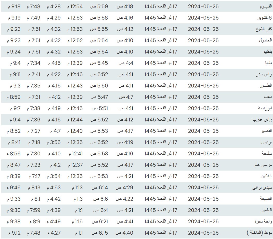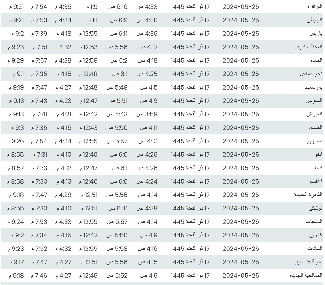 وفيما يلي مواقيت الصلاة، لعدد من مدن ومحافظات الجمهورية من واقع بيانات الهيئة العامة للمساحة