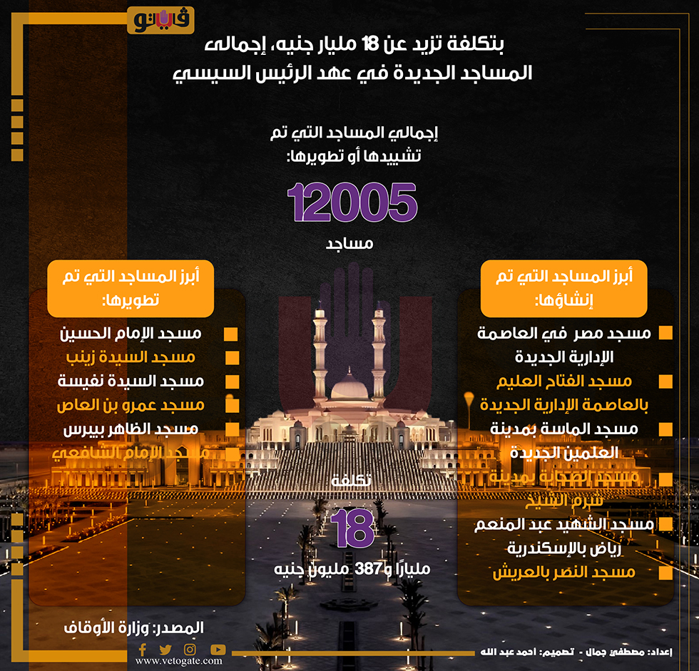 بتكلفة تزيد عن 18 مليار جنيه، إجمالى المساجد الجديدة في عهد الرئيس السيسي (إنفوجراف) الأحد 19/مايو/2024 - 05:30 م 5/19/2024 5:30:29 PM مصطفى جمال شارك طباعة 18 حجم الخط شارك طباعة الرئيس السيسي مسجد مصر في العاصمة الإدارية الجديدة مسجد الفتاح العليم بالعاصمة الإدارية الجديدة مسجد الماسة بمدينة العلمين الجديدة مسجد الصحابة بمدينة شرم الشيخ مسجد النصر بالعريش مسجد الامام الحسين مسجد السيدة زينب وزارة الأوقاف