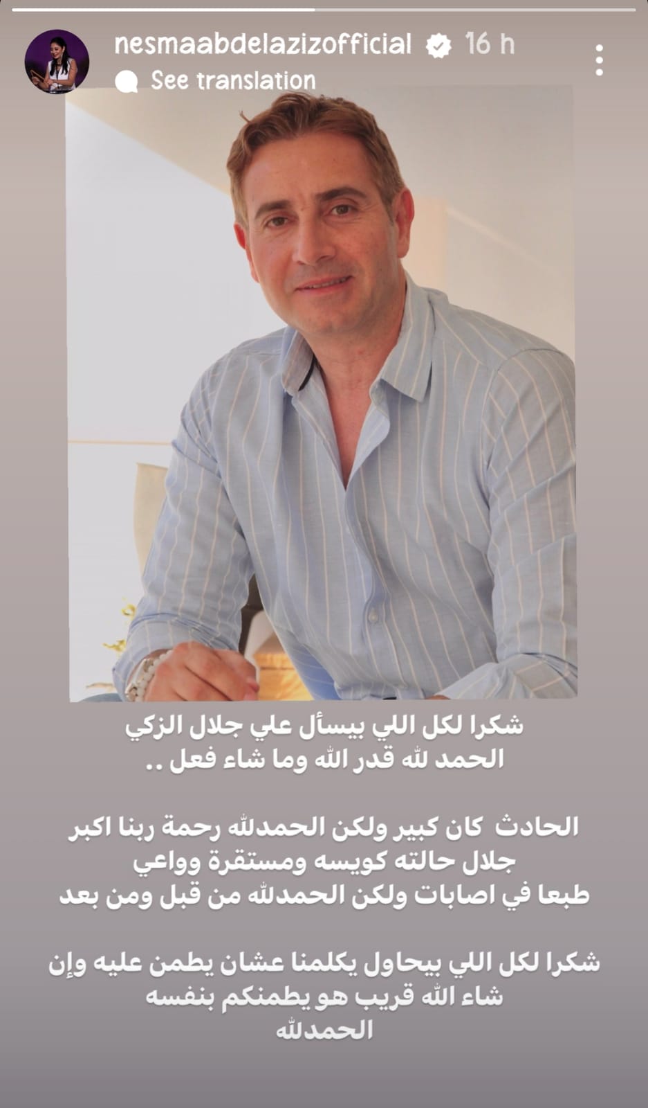 ونشرت نسمة على صفحتها الرسمية بموقع الصور والفيديوهات القصير"انستجرام" قصة قصيرة بصورة للفنان جلال الزكي توضح بها آخر تطورات حالته الصحية، حيث قالت: “الحادث كان كبيرا ولكن الحمد الله رحمة ربنا أكبر، جلال حالته كويسة ومستقرة وواعي، طبعًا في إصابات ولكن الحمد الله من قبل ومن بعد”.