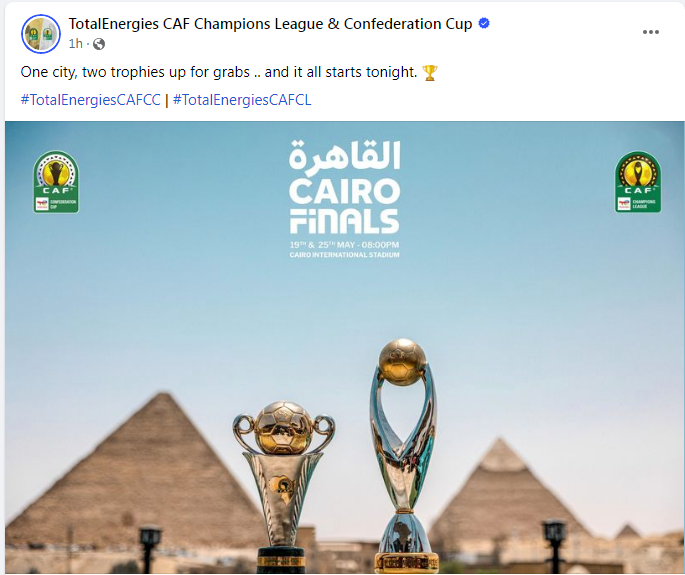 ونشر حساب دوري أبطال إفريقيا والكأس الكونفيدرالية، التابعة للاتحاد الإفريقي لكرة القدم "كاف"، صورة لكأسي البطولتين عند سفح الأهرامات، وكتبت أن نهائي البطولتين يقامان في مدينة واحدة "القاهرة"، في استاد القاهرة الدولي.