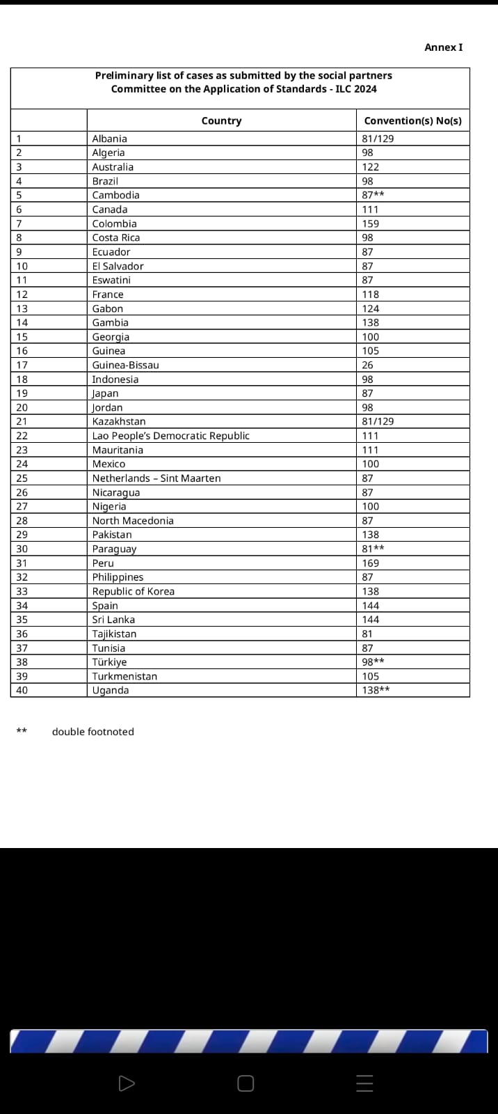 أعلن حسن شحاتة وزير العمل اليوم الأحد، أن منظمة العمل الدولية التابعة للأمم المتحدة لم تُدرج مصر على قائمة الملاحظات الدولية المُقرر مُناقشتها خلال فعاليات الدورة 112 لمؤتمر العمل الدولي المُنعقد في جنيف مطلع الشهر المُقبل "يونيو 2024" بحضور مُمثلين عن 187 دولة حول العالم من "وزارات عمل وأصحاب أعمال وعمال".