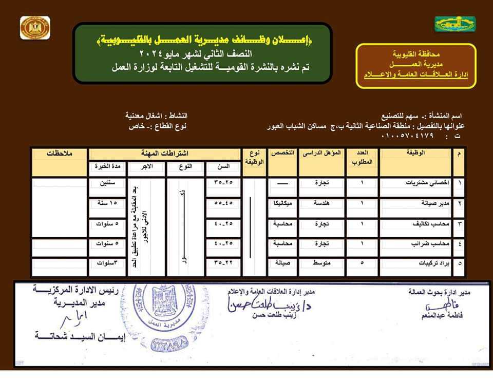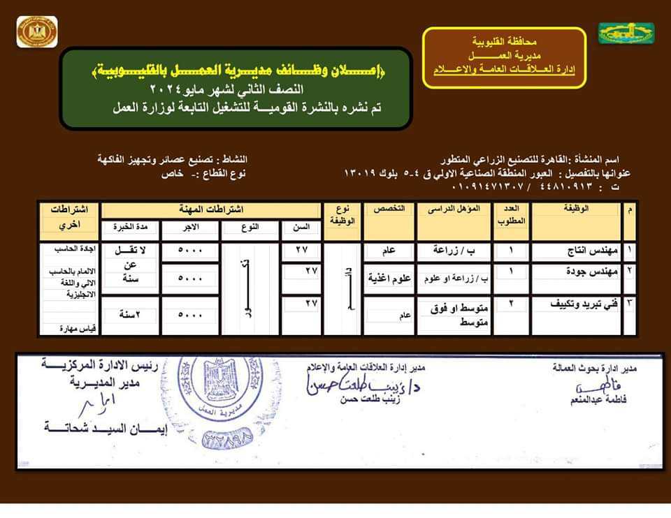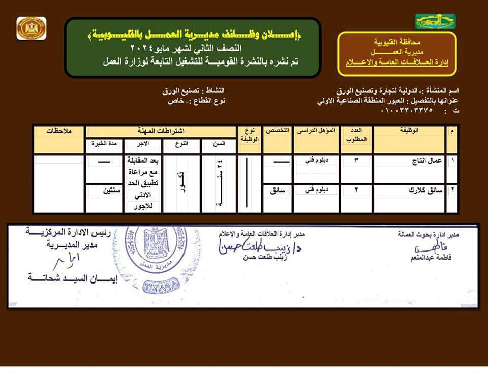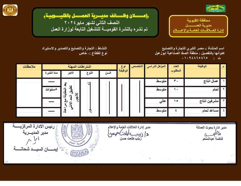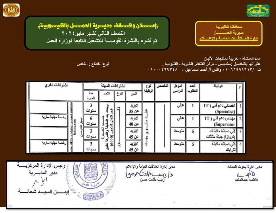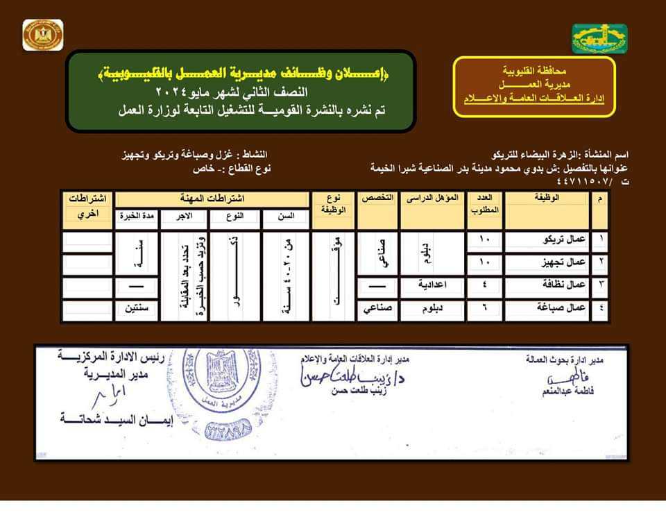 الوظائف المتاحة بالقوى العاملة بالقليوبية