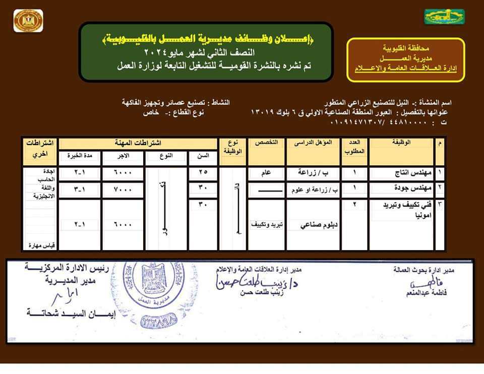 أوضح اللواء عبد الحميد الهجان محافظ القليوبية أن الوظائف المتاحة في النشرة القومية للتوظيف التي تصدرها وزارة العمل وتنفذها مكاتب العمل على مستوى المحافظة والمديرية بـ بنها الأخيرة ضمت 143 فرصة في 8 شركات ومصانع بمرتبات مجزية حيث تتوافر الوظائف كالتالي: