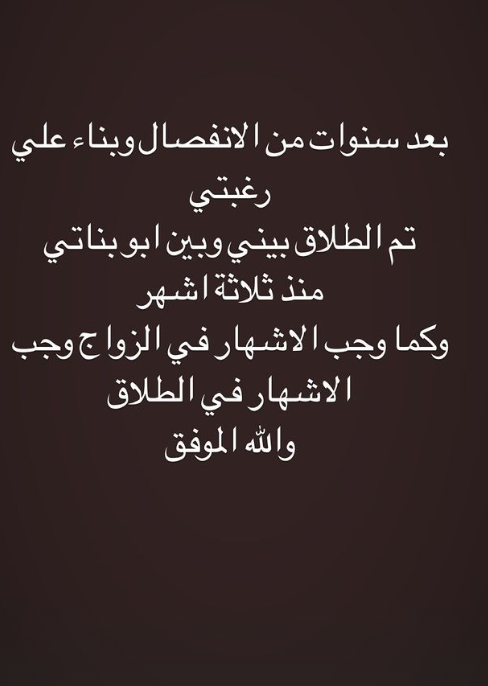 في هذا السياق، كتبت ريهام عياد عبر ستوري حسابها بموقع إنستجرام: بعد سنوات من الانفصال وبناءً على رغبتي تم الطلاق بيني وبين أبو البنات منذ ثلاثة أشهر، وكما وجب الإشهار في الزواج، وجب الإشهار في الطلاق.