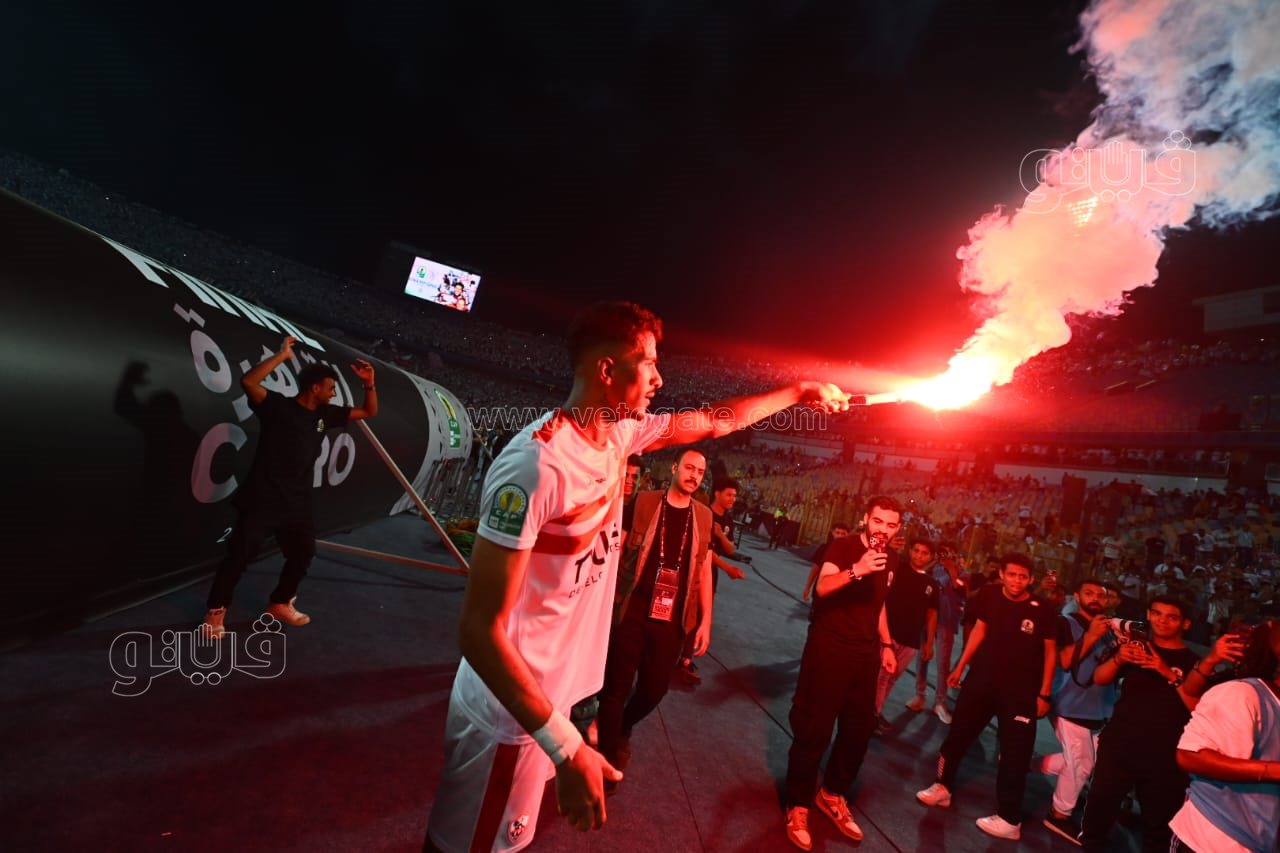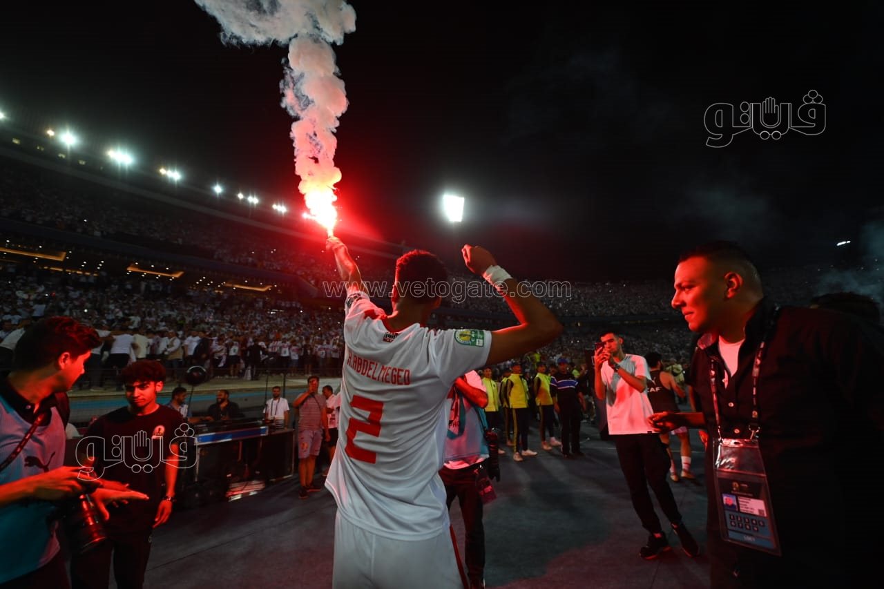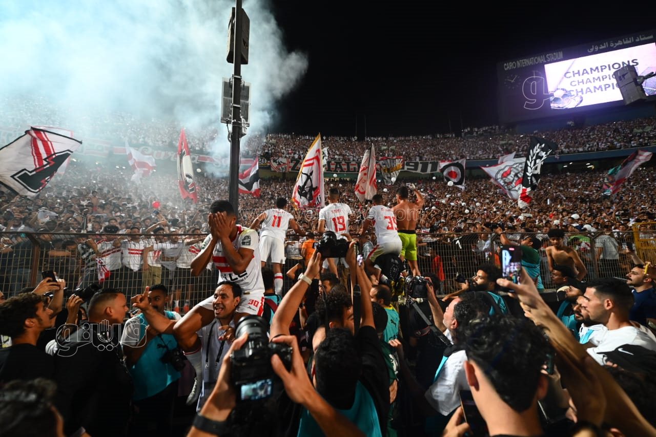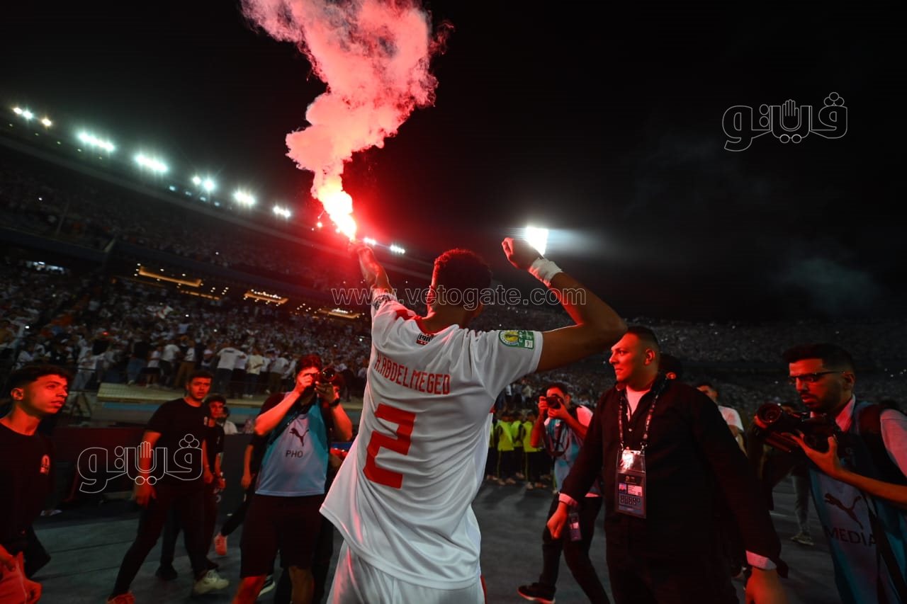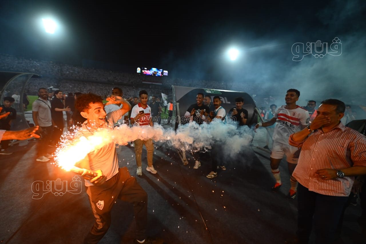 احتفل لاعبو الزمالك بكأس الكونفدرالية رفقة جماهير القلعة البيضاء داخل ملعب ستاد القاهرة بالشماريخ بعد الفوز على نهضة بركان المغربي بهدف دون رد.