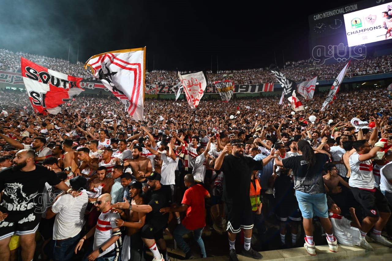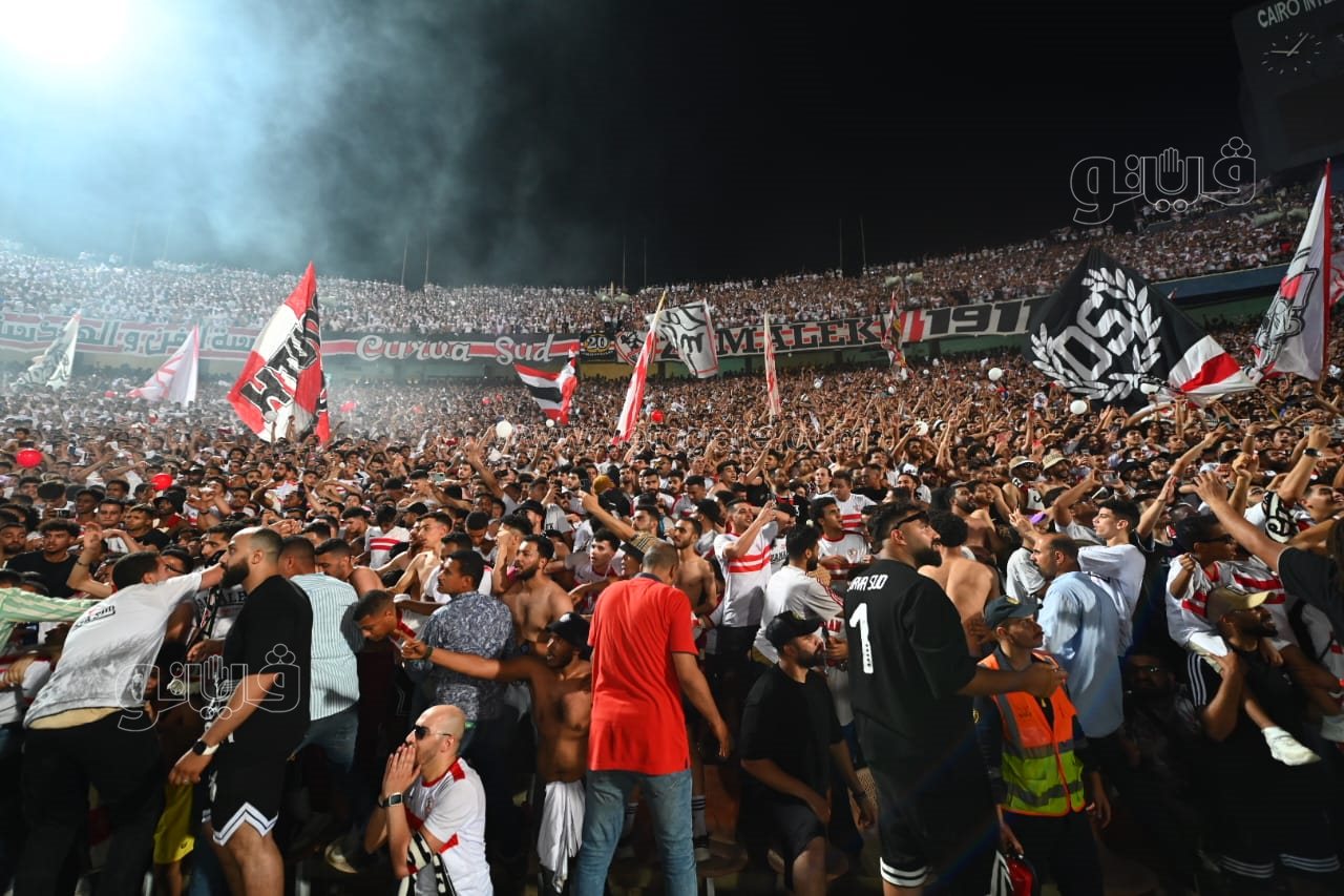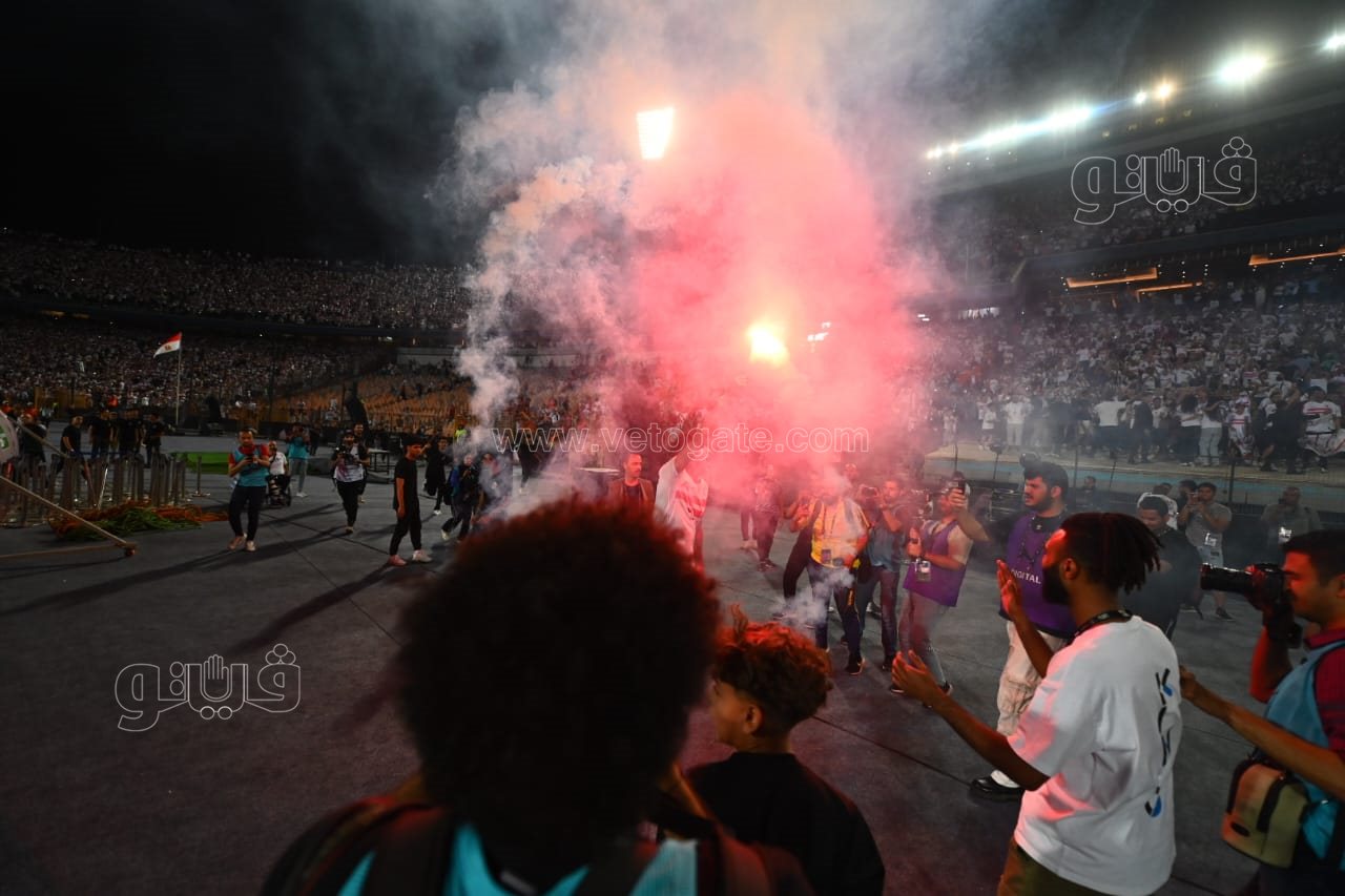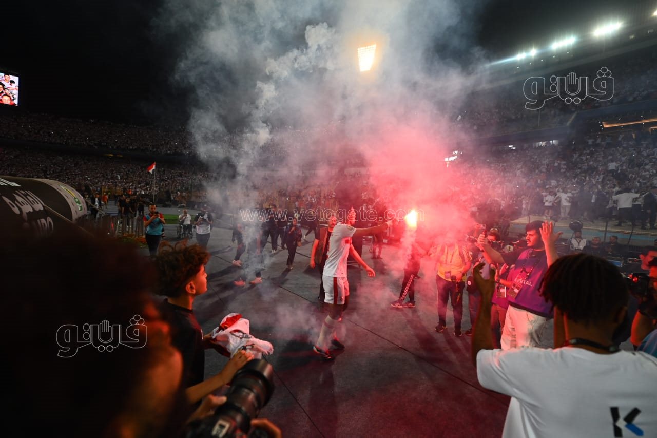 احتفل لاعبو الزمالك بكأس الكونفدرالية رفقة جماهير القلعة البيضاء داخل ملعب ستاد القاهرة بالشماريخ بعد الفوز على نهضة بركان المغربي بهدف دون رد.