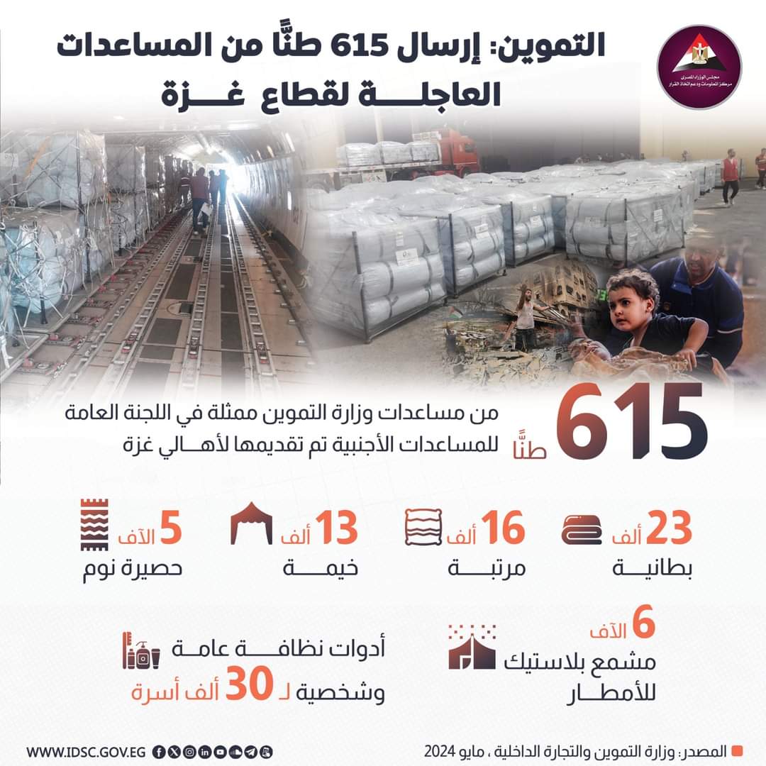 كشف مركز المعلومات ودعم اتخاذ القرار بمجلس الوزراء عن إرسال التموين لـ 615 طنا من المساعدات العاجلة إلى غزة.