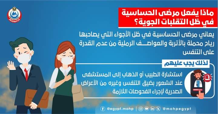 وأكدت وزارة الصحة ضرورة استشارة مرضى الحساسية للطبيب المعالج لكيفية التعامل مع التقلبات الجوية بجانب الذهاب لأقرب مستشفى عند الشعور بأعراض ضيق التنفس.