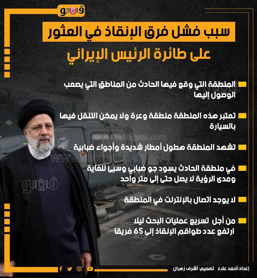 وأشار عسكر إلى وجود احتمالات أخري لتحطم طائرة الرئيس الإيراني، ومنها "قنبلة كانت على متن الطائرة، أو اصطدام بجبل نتيجة لعدم الرؤية وسط الضباب، أو صاروخ أرض جو.."