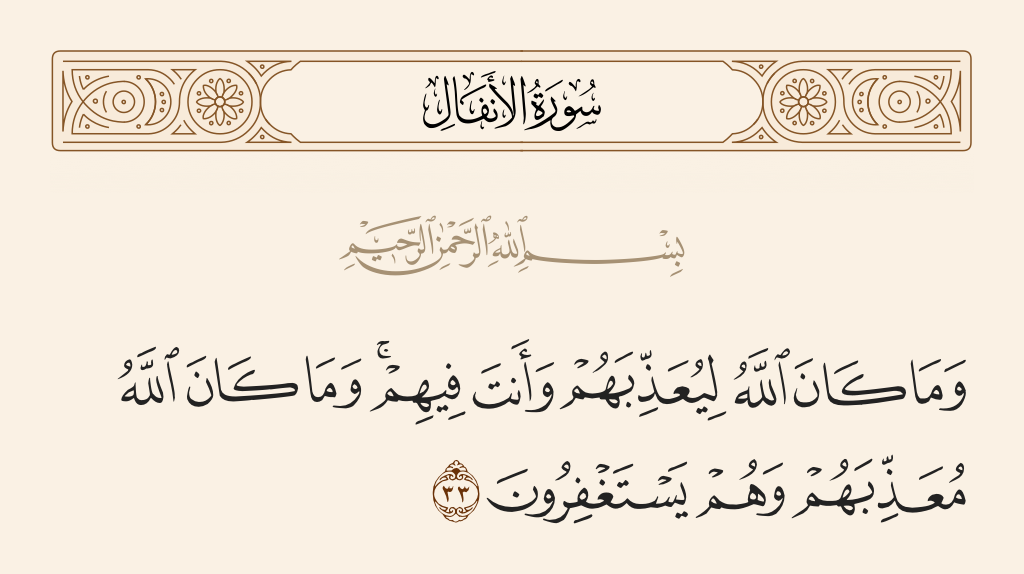 قال تعالى: «وَمَا كَانَ اللَّهُ لِيُعَذِّبَهُمْ وَأَنْتَ فِيهِمْ وَمَا كَانَ اللَّهُ مُعَذِّبَهُمْ وَهُمْ يَسْتَغْفِرُونَ».