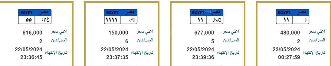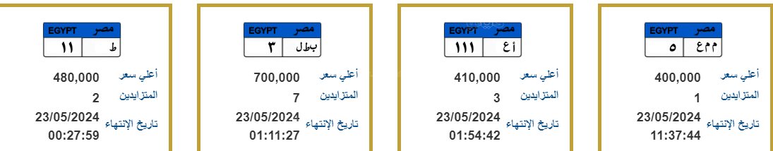 كما طرحت اللوحة المعدنية المميزة : " ن ص 1111" بقيمة 150 ألف جنيه ويتنافس عليها 6 أشخاص، فيما يتنافس شخصين على اللوحة المعدنية " ع م ر 55 " والتى وصل سعرها لـ 616 ألف جنيه.