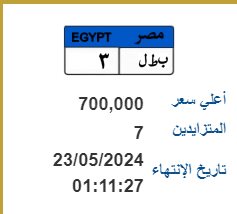 كما وصل سعر لوحة معدنية مميزة " م م ع 5" بقيمة 400 ألف جنيه، " أ ع 111" بقيمة 410 ألف جنيه ويتنافس عليها 3 أشخاص ، أما اللوحة المعدنية " ب ط ل 3 " سجلت سعر 700 ألف جنيه ويتنافس عليها نحو 7 أشخاص، و" ط 11 " بقيمة 480 ألف جنيه ويتنافس عليها شخصين.
