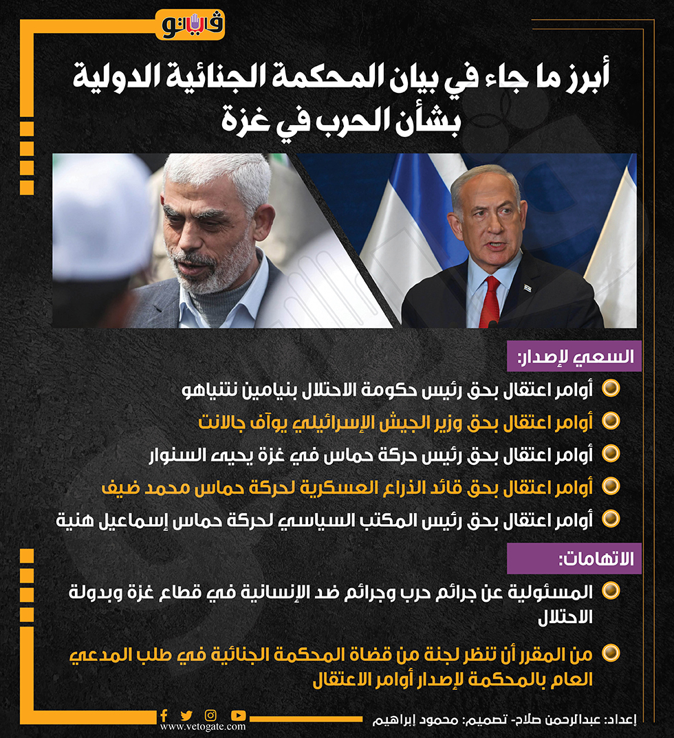أبرز ما جاء في بيان المحكمة الجنائية الدولية بشأن الحرب في غزة (إنفوجراف) الإثنين 20/مايو/2024 - 07:09 م 5/20/2024 7:09:02 PM السنوار ونتنياهو، فيتو عبدالرحمن صلاح شارك طباعة 18 حجم الخط شارك طباعة نتنياهو جالانت يحيى السنوار السنوار محمد الضيف حركة حماس إسماعيل هنية قطاع غزة دولة الإحتلال