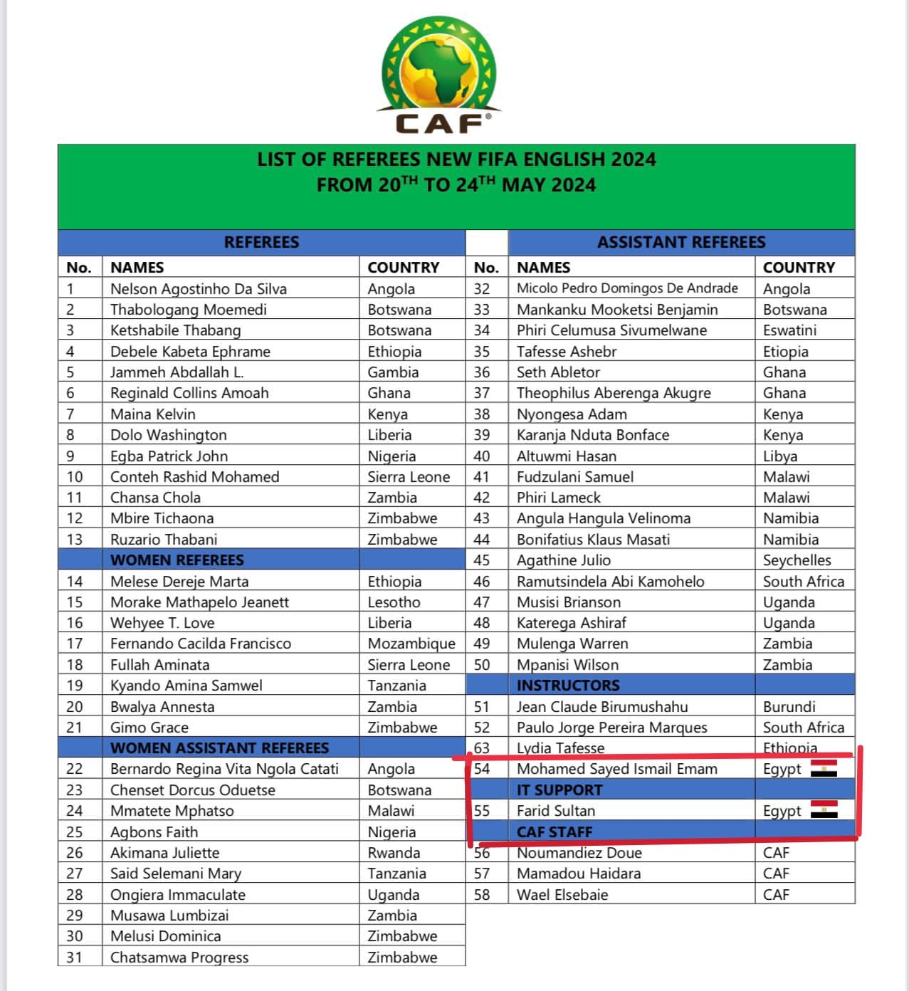 كاف، أعلنت لجنة الحكام الرئيسية بـالاتحاد الأفريقي لكرة القدم عن قائمة الحكام الواعدين المشاركين في كورس FAFA List للحكام الجدد.