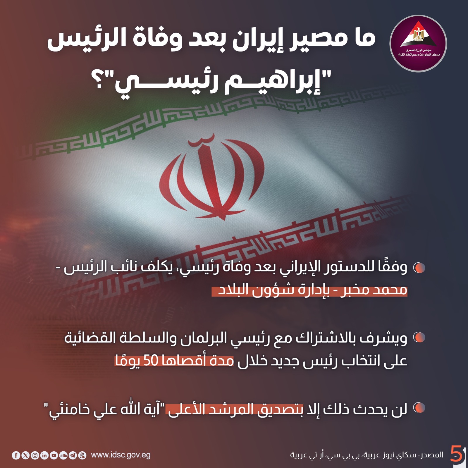 سلط مركز المعلومات ودعم اتخاذ القرار بمجلس الوزراء الضوء على مصير إيران بعد وفاة الرئيس إبراهيم رئيسي.
