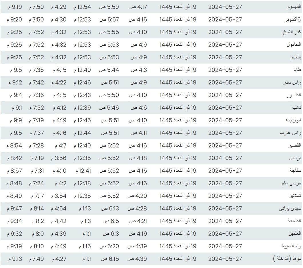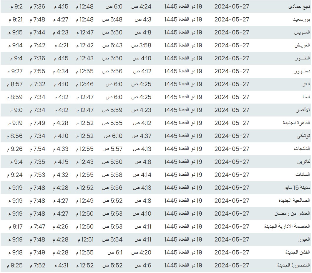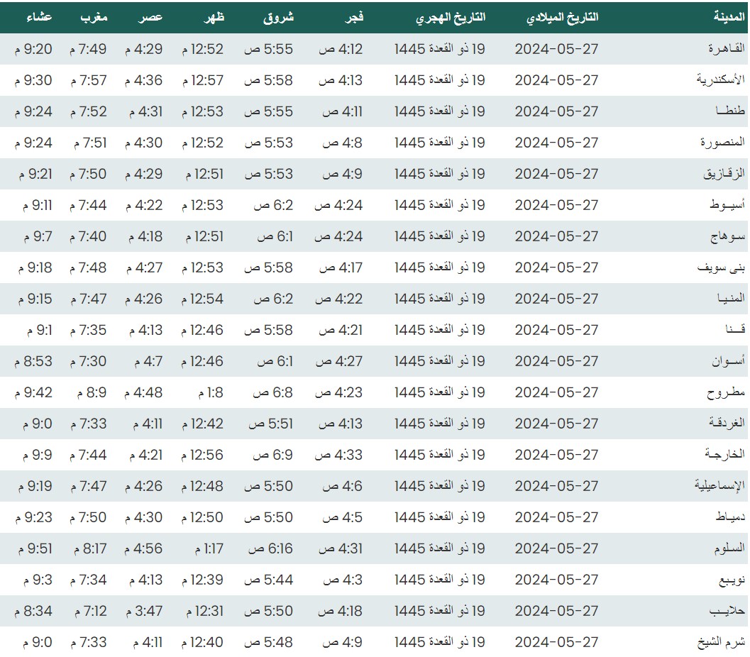 وفيما يلي مواقيت الصلاة، لعدد من مدن ومحافظات الجمهورية من واقع بيانات الهيئة العامة للمساحة