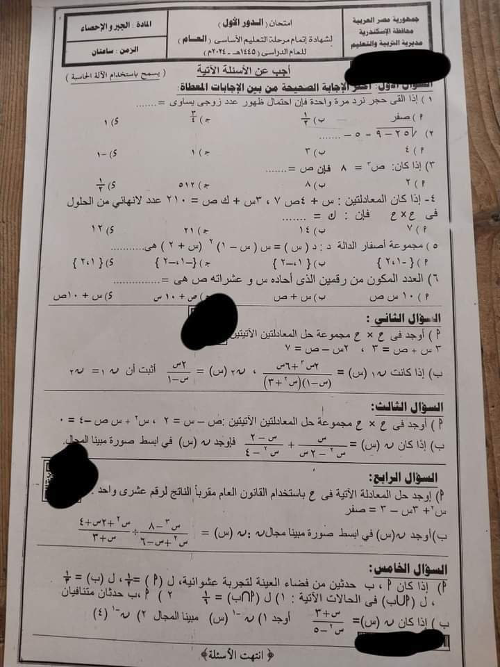 أخطاء في امتحان جبر الإعدادية بالإسكندرية