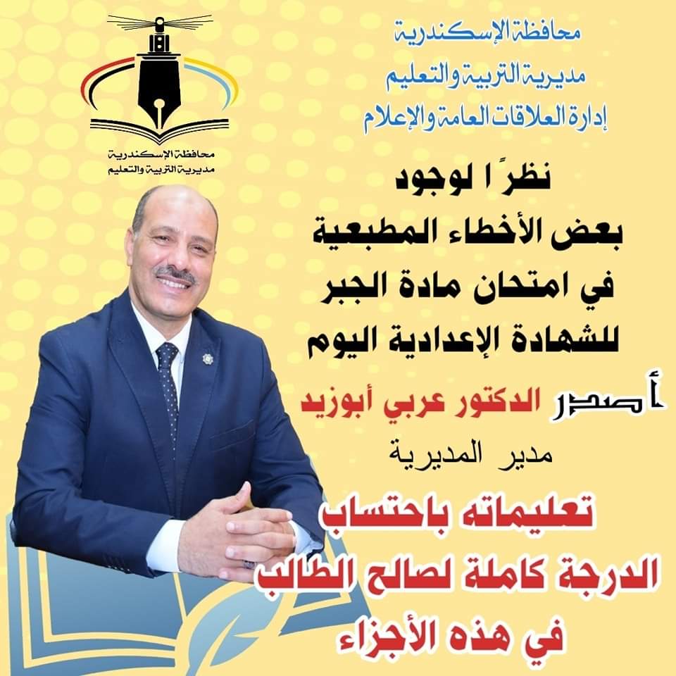 أعلن الدكتور عربي أبو زيد مدير مديرية التربية والتعليم بالإسكندرية، عن احتساب الدرجة كاملة في امتحان الشهادة الإعدادية لمادة الجبر في الأجزاء التي بها أخطاء.