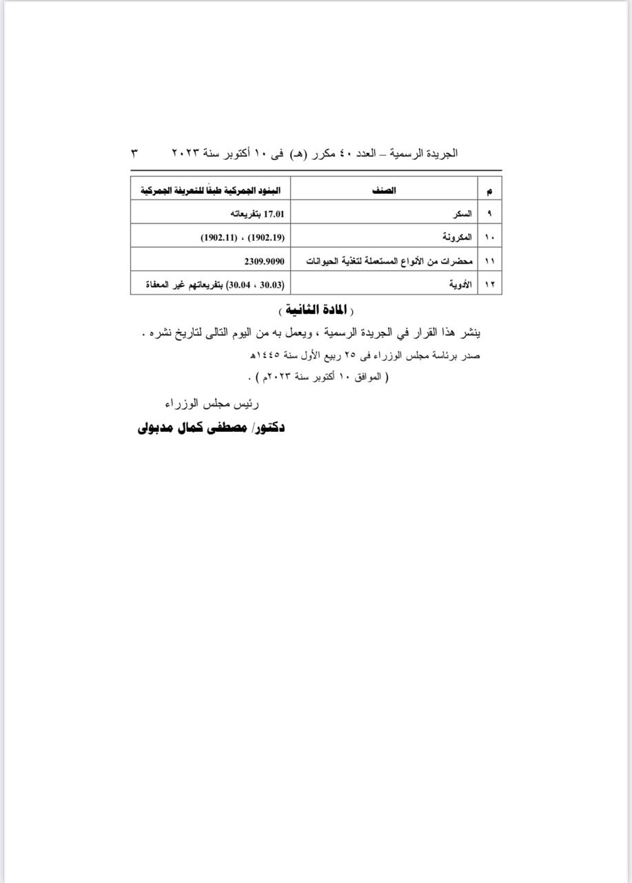 وأصدر الدكتور مصطفى مدبولي، رئيس مجلس الوزراء، قراره رقم 1613 لسنة 2024، الذي ينص على مد فترة إعفاء عددًا من السلع المستوردة والتي تضمنها القرار الصادر في أكتوبر الماضي لثلاثة أشهر إضافية وأبرزها السكر والدواجن ومنتجات الألبان والشاي من الضريبة الجمركية.