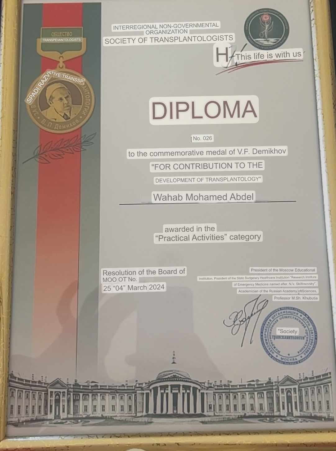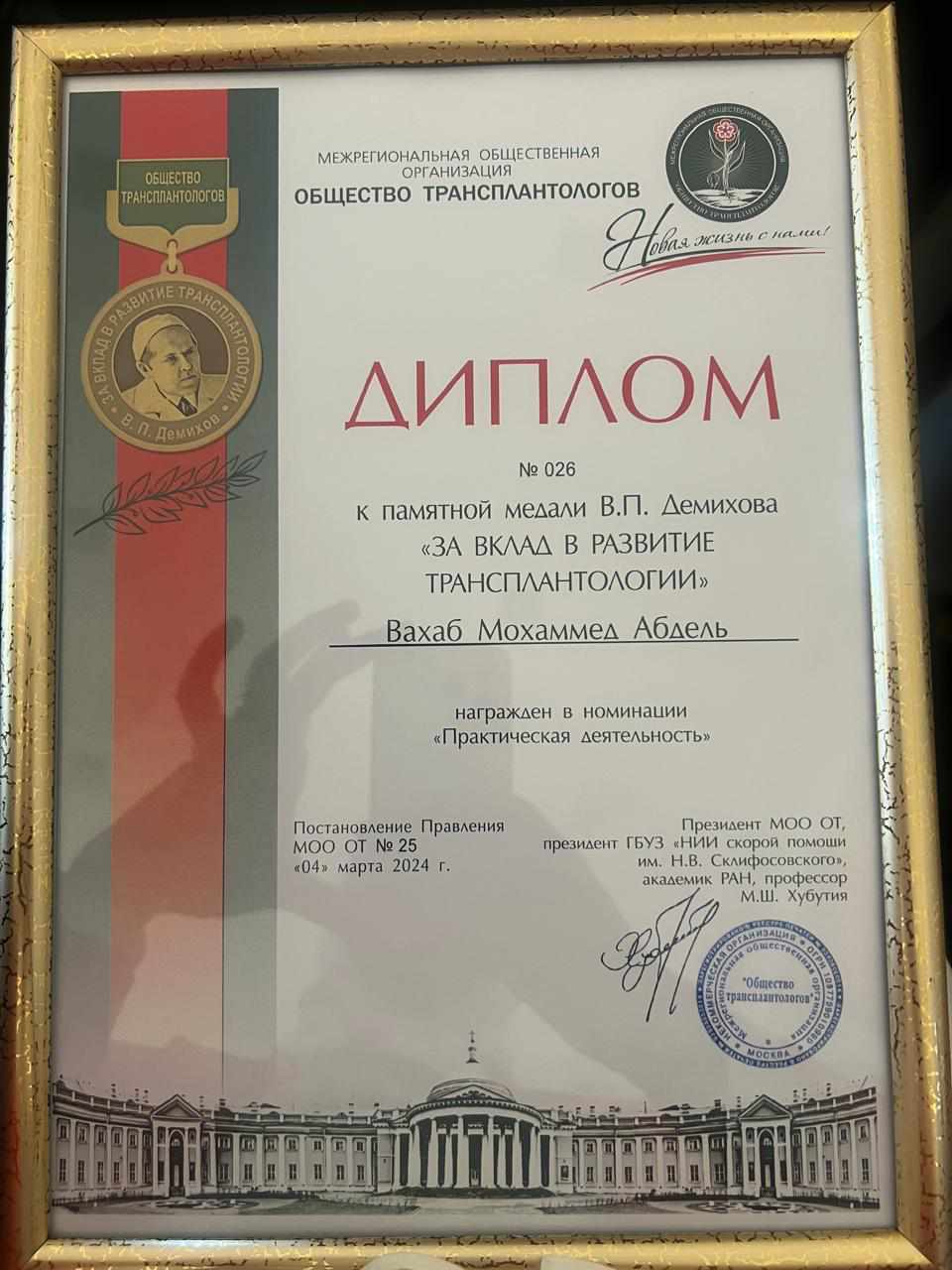 كرمت الجمعية الروسية لأخصائي زراعة الأعضاء ومعهد سكليفوسوفسكي ونظام موسكو للرعاية الصحية العالم المصري الدكتور محمد عبد الوهاب رئيس فريق زراعة الكبد بجامعة المنصورة ومنحه جائزة وسام "ديمخوف" الذي يحمل اسم عالم زراعة الأعضاء الروسي الكبير فلاديمير ديمخوف وذلك تقدير لجهود "عبد الوهاب" في مجال زراعة الأعضاء وجاء في حيثيات تكريمه أن ذلك يأتي "مع الأخذ في الاعتبار خدماتك التي لا تقدر بثمن لزراعة الأعضاء في العالم".