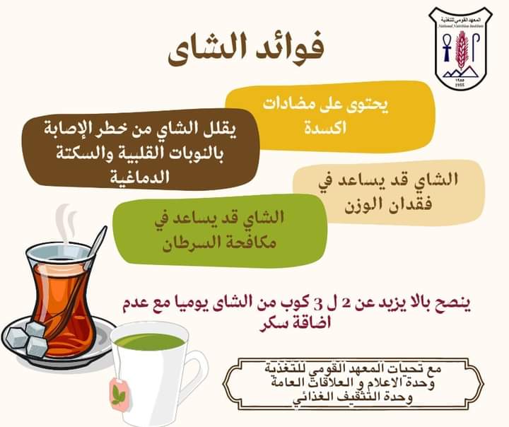 كما ان الشاي يعمل على تنشيط الجسم لأنه ينشط الدورة الدموية ويحمي من السرطان ويساعد في الوقاية من النوع الثاني من مرض السكر ويقاوم الالتهابات بالجسم.